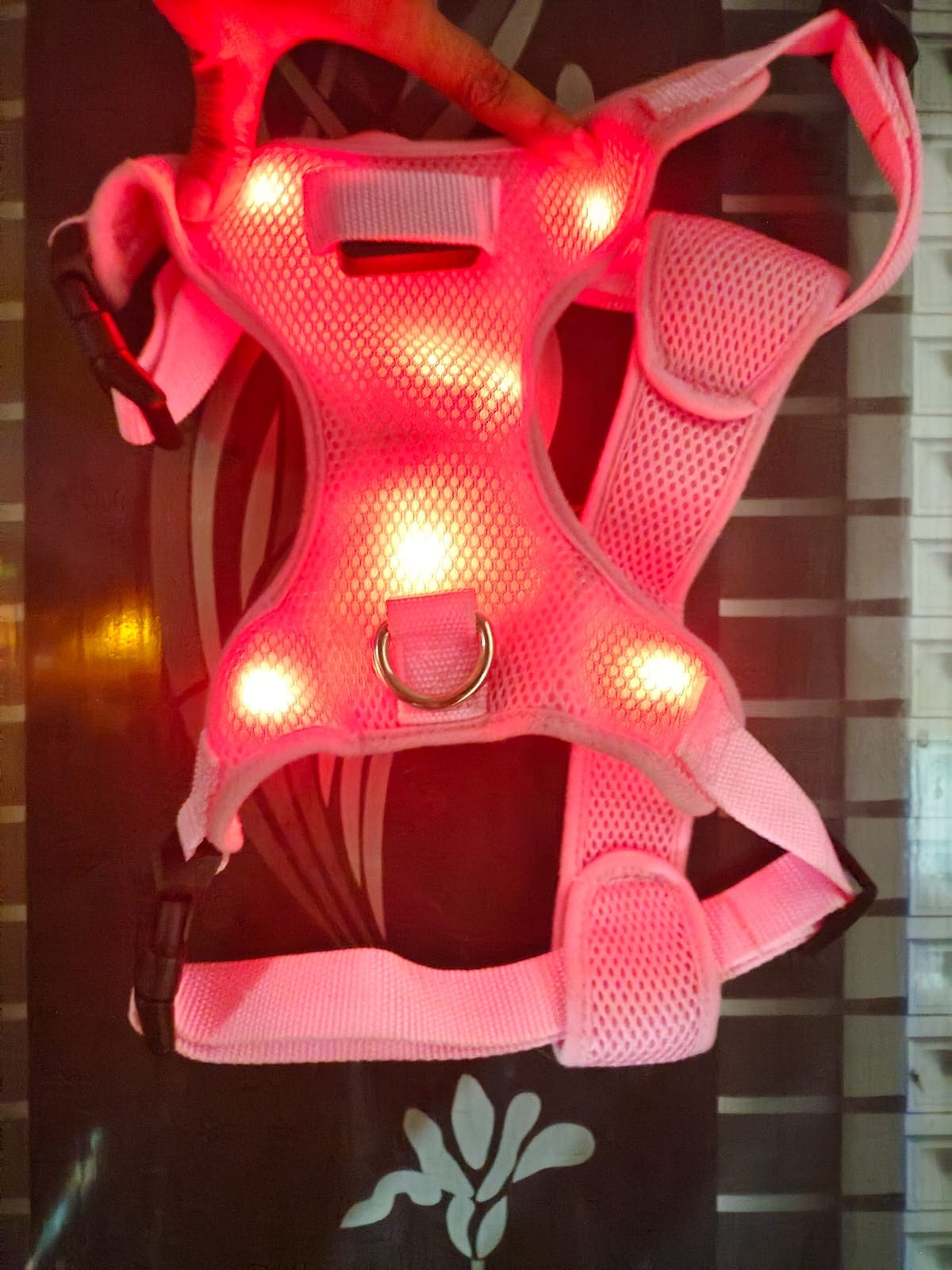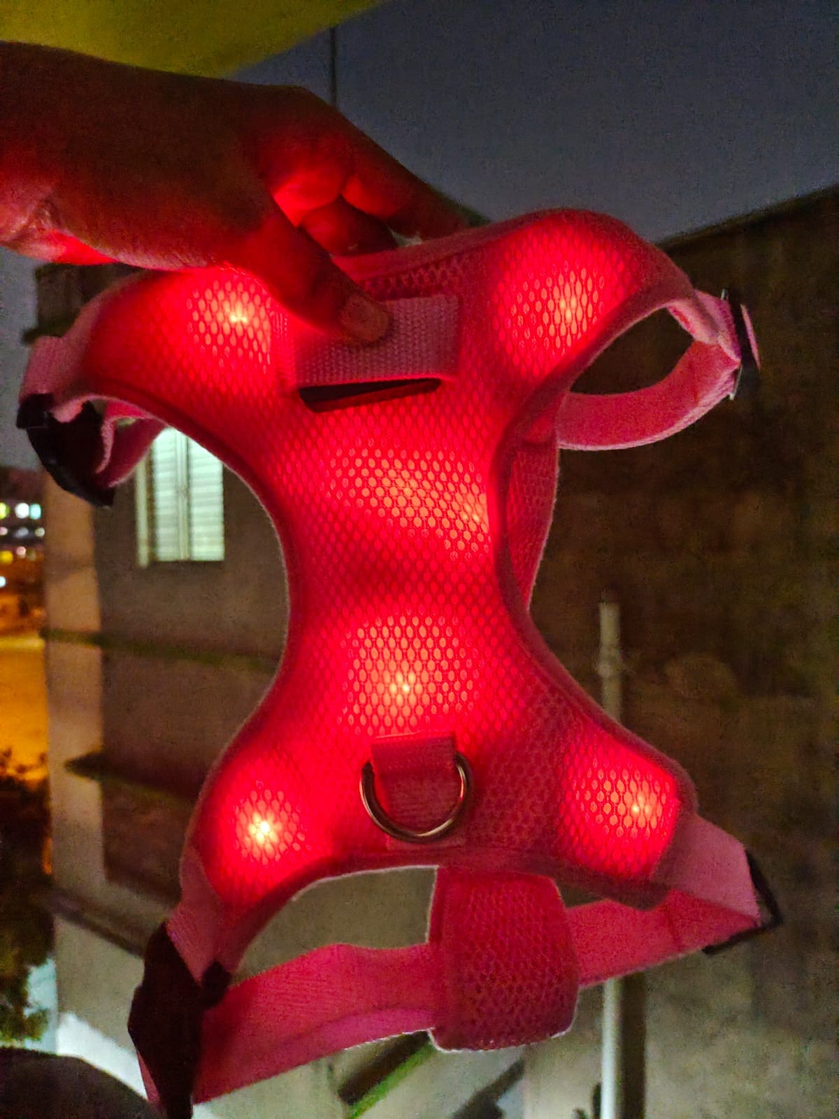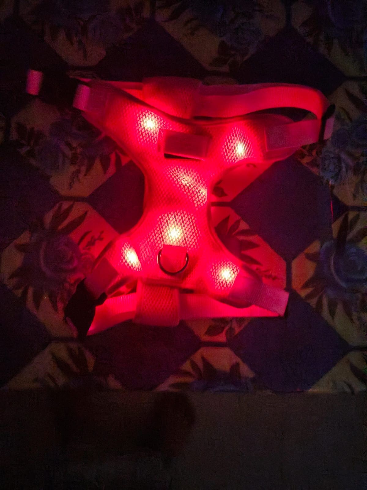 This is just what I have been looking for . My baby loves it. She seems to be more comfortable in this harness than the one I had been using. The led lights are amazing. I also have a leash that with led lights so we can not be missed!