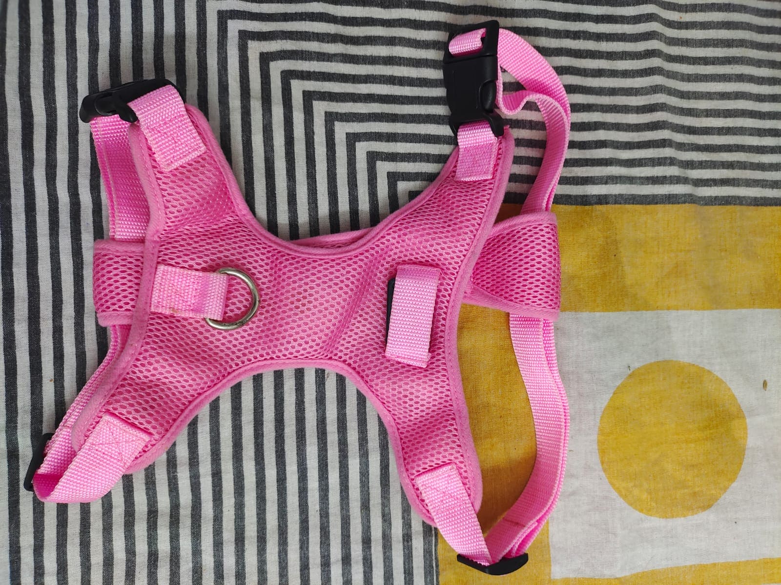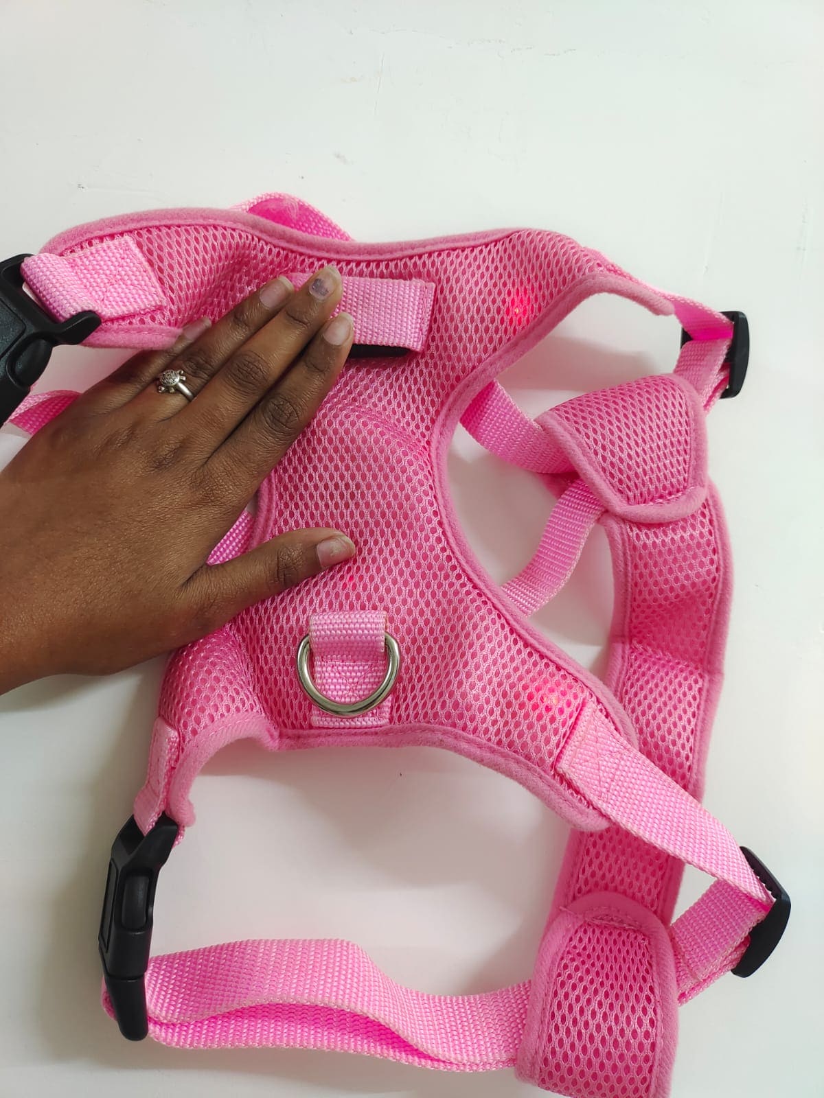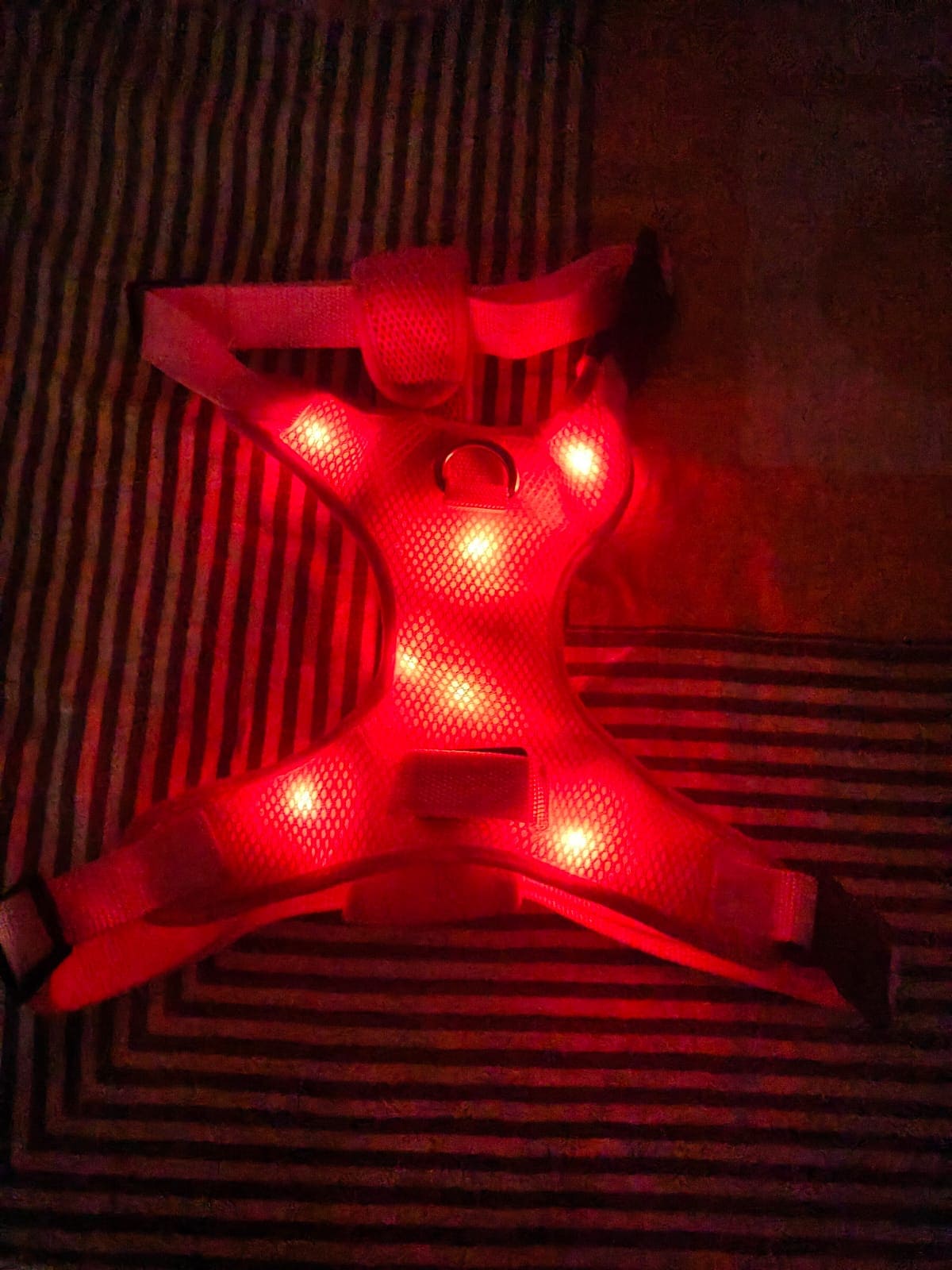 This is just what I have been looking for . My baby loves it. She seems to be more comfortable in this harness than the one I had been using. The led lights are amazing. I also have a leash that with led lights so we can not be missed!